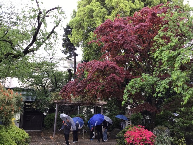 雨に濡れ、新緑が一層鮮やかです。シャクナゲやツツジ、藤の花が色とりどりに咲き誇りまさに百花繚乱です。選定され枝ぶりが見事な松など立派なお庭に目を奪われてしまいました。今年の展覧会でお披露目しますので楽しみにしていてください。