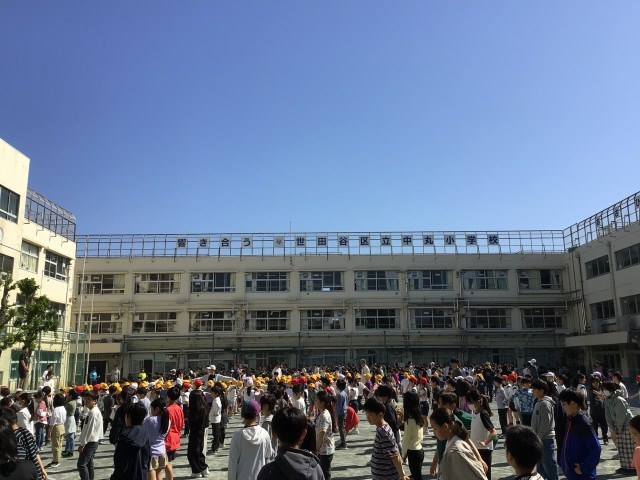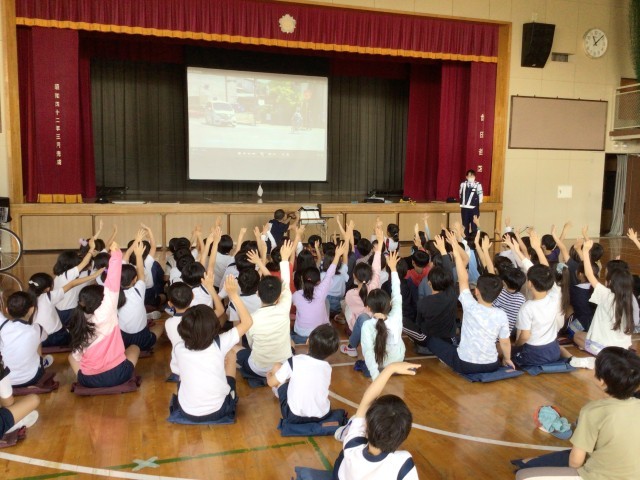 3時間目。3年生からは一人で自転車に乗れるようになるので、安全に正しく自転車に乗るために世田谷警察署の方から大切なことを教えていただきます。3年生のほぼ100%の子どもたちはヘルメットを持っていました。まずは一安心です。