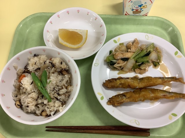 豆入りひじきごはん ししゃものカレー天ぷら きのこ入り煮びたし 河内晩柑 牛乳