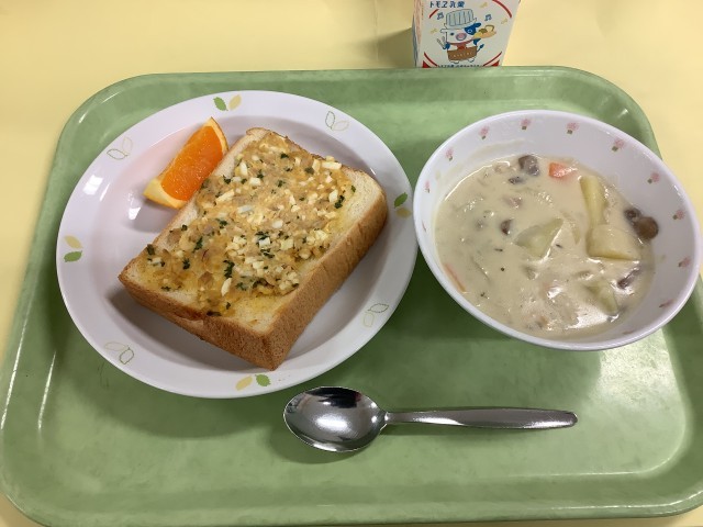 たまごとツナのトースト クリームシチュー きよみオレンジ 牛乳