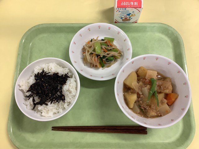 ごはん しそひじきふりかけ 新じゃがのそぼろ煮 おひたし 牛乳