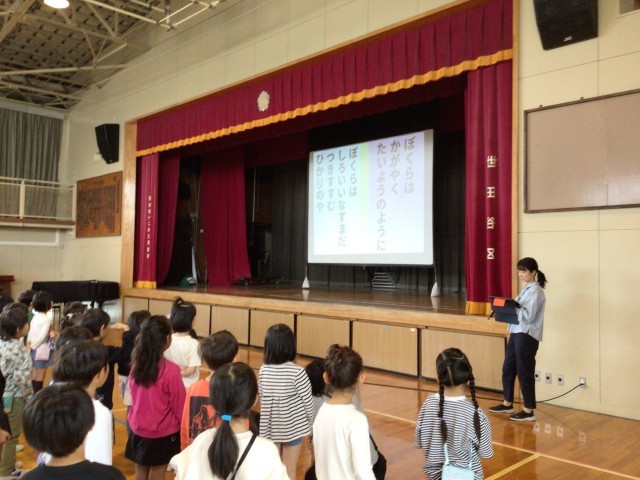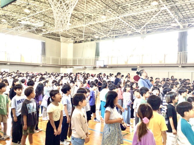 2週間後の運動会に向けて、全校児童で歌う「ゴーゴーゴー」の練習をしました。この歌が教室や音楽室から聞こえ出すと「運動会が始まる」と実感します。赤組と白組に分かれて歌います。今日のところは、どちらも元気に歌っていていい勝負です。