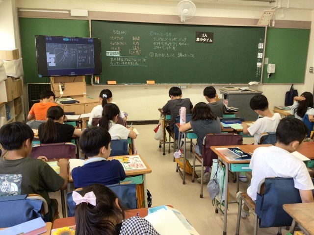 3年生は、昆虫の体について学んでいます。クラスでモンシロチョウを育ててきたので、チョウの体については、よく理解できています。自分の知りたい、調べたい昆虫についてこれから子どもたちは一人一人自分の学習問題をもって取り組んでいきますが、チョウとの共通点、相違点を意識させていくのがポイントです。3年生以上は教科担任制を取り入れていますが、どのクラスも理科好きな意欲的な子どもたちが多くうれしいです。