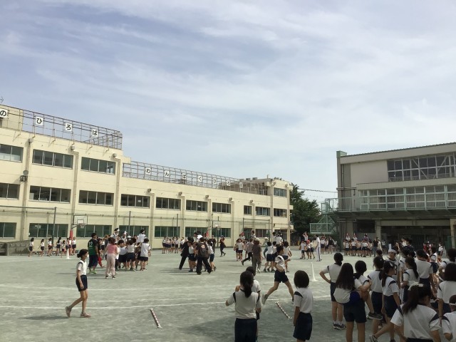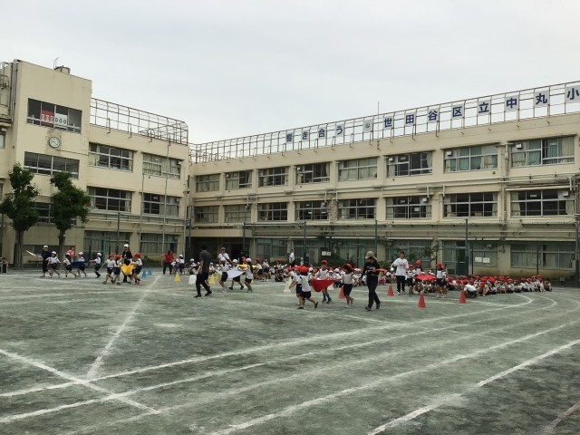 今日の1時間目は、1・2年生の団体種目「1・2・1・2ボールでGo」と5年生の家庭科、5時間目は、1年生の国語と5・6年生の団体種目「中丸の合戦」を見ました。