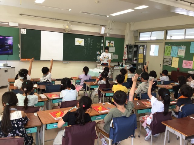 5時間目ですが、1年生はよく授業に集中していて立派でした。主語と述語を「が」や「は」でつなげて一文にして書き取っていきます。ノートの使い方も2回目ですが、見やすくていねいに文を書き取れていました。