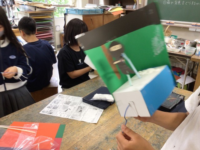 クランク機構を使って、くるくる回る立体作品に取り組む5年生。うまく回らないときも微調整に何度も取り組み、イメージの動きに近づけようとしていました。
