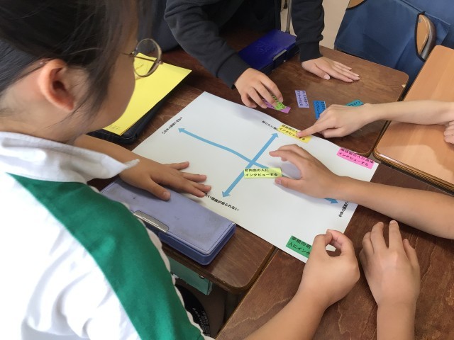 別のクラスの5年生は、地域の人のためにできることを考えていました。野沢・下馬地域の人から考えを聞く10個の方法を座標軸を使って整理し話し合っていました。インタビューもアンケートもどちらもやりたい、商店会の人に聞くならインタビューがいいなど、課題解決に向け取り組む5年生です。