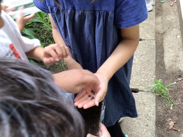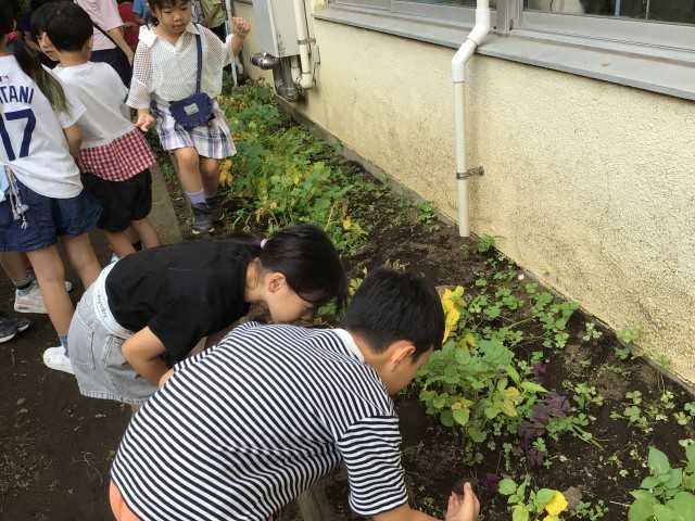 2年生の子どもたちが、理科室横の学級園で楽しそうにダンゴムシを探しています。班ごとに集めて観察、飼育します。「ダンゴムシ」といっても大きさや色が様々です。「黄色」っぽいレアなダンゴムシをうれしそうに見せてくれました。ダンゴムシにとって快適な生息条件を調べて大切に育ててほしいです。