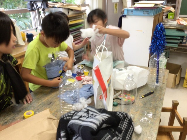 3年生は、いつもは教室で図工を行いますが、今日は特別に図工室を使って学習しています。家から持参した毛糸や服、ペットボトルなどを使って「生まれかわったなかまたち」を作っています。広い図工室の机で楽しそうに「なかま」を作っていました。