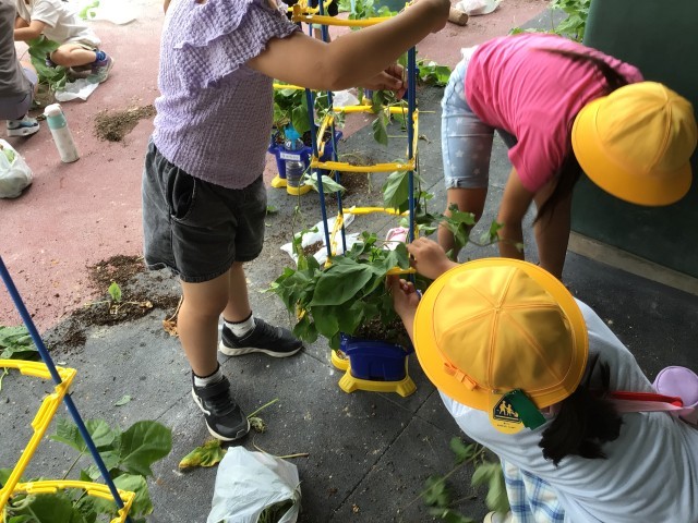 1年生が保護者の方と一緒にアサガオの鉢に支柱を付けていました。「支柱より伸びてる!」とうれしそうな子どもたちです。「花が咲いたよ!」と早くも咲いている一輪を教えてくれました。水やりのお世話をお願いします。