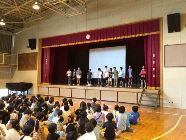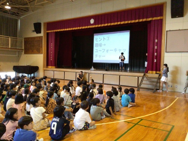 今日の朝は、集会委員によるゲーム集会「この先生はだれでしょうクイズ」がありました。4月から中丸小に着任した先生を中心に、好きな食べ物や趣味、あだ名などのヒントから先生を当てます。子どもたちは、自分の担任や前学年の担任の先生についてよく知っていて驚かされました。中丸の先生が大好きな子どもたちです。