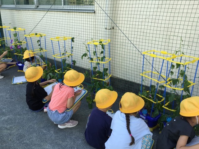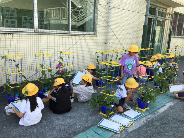 1年生が涼しいうちにアサガオの観察を行っていました。「葉っぱのまるがかけない」といいながらアサガオの特徴のある葉の形を描いています。「花が5つも咲いた」「同じアサガオなのに花の色が違うよ」と発見したことを教えてくれる子どもたちです。