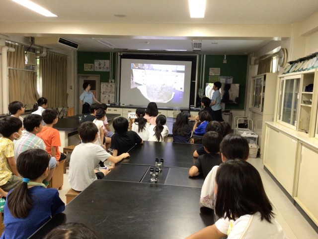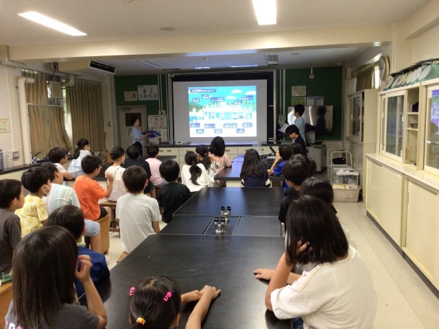 4年生は、理科室で東京都水道局の方から「水道キャラバン」の出前授業を受けていました。水道の蛇口から、あたりまえのように24時間365日、安全でおいしい水が飲めるのは水道事業のおかげです。浄水場のはたらきを動画視聴だけでなく実際に、にごりなどの汚れが凝集剤を使って沈殿していく様子を観察し子どもたちは驚いていました。水源林の保全、ダムの管理、取水量の調整、浄水処理、水道管の保守点検など、私たちの家庭の蛇口に水が届けられるまで多くの方の努力と工夫があることを子どもたちは学びました。今日も暑くなります。こまめに水分をとって熱中症を防いでいきます。