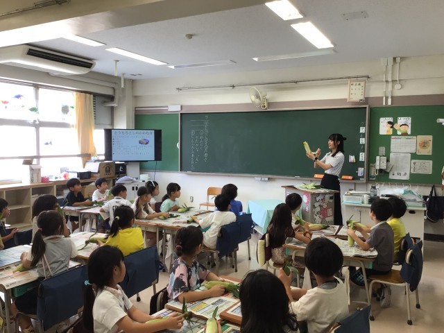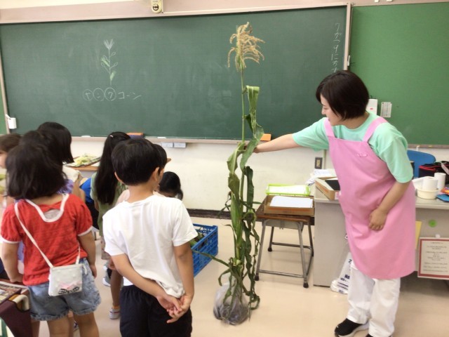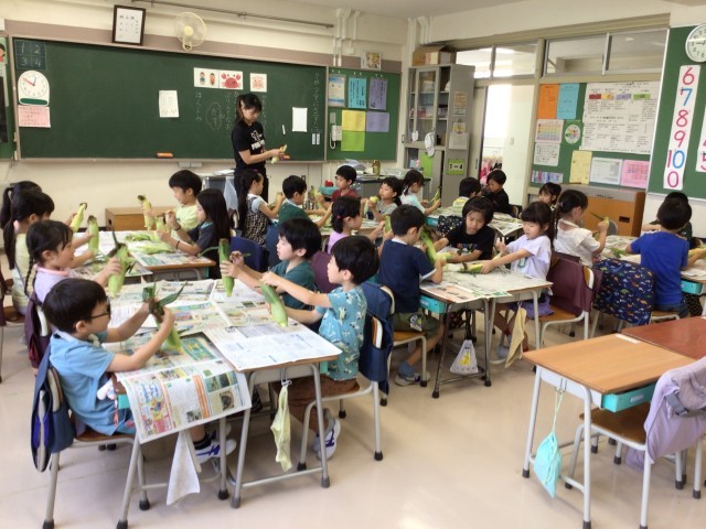 1年生教室からなにやらよいにおいが漂ってきます。新鮮なとうもろこしのにおいでした。
