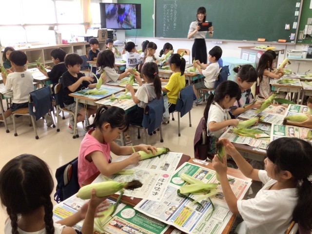 今日の給食に出るとうもろこしの皮を1年生の子どもたちがていねいにむいています。