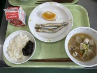 今日の献立のりの佃煮ごはん 焼きししゃも けんちん汁 ネーブルオレンジ 牛乳今日...