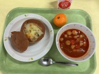今日の献立丸パン メンチカツ キャベツ ミネストローネ 牛乳丸パン、メンチカツ、...