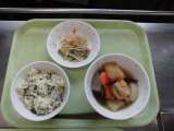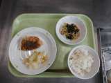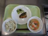 <本日の献立> わかめごはん 魚の一味焼き かぶのレモンしょうゆかけ 呉汁 <...