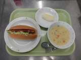 <本日の献立> ホットドッグ 魚のチャウダー くだもの <主な産地> キャベツ...