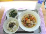ランチ☆つうしん 今日の献立は、ごはんとひじきのふりかけ、いろどり煮、野菜...