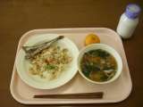 ランチ☆つうしん 今日の献立は、子ぎつねごはん、豆腐団子のきのこ汁、焼きししゃ...