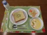 今日の献立)あしたばパン・セレクトドリンク・フレンチエッグ・ミネストローネスープ...