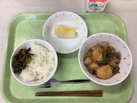 せたがや育ち給食今日の献立ごはん 小松菜のふりかけ 肉じゃがうま煮 りんご 牛乳...