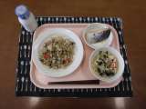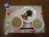 今日の献立 中丸ラーメン・牛乳・青菜ののりあえ・りんご入り大学芋 食事をする...