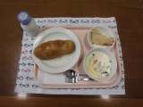今日の献立 揚げパン・牛乳・魚のガーリック焼き・クリームスープ 揚げパンは給...