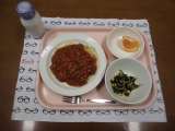 今日の献立 スパゲティーミートソース・牛乳・ひじきと大根のサラダ 果物(ブラ...