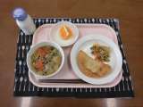 今日の献立 カレーうどん・牛乳・ジャンボぎょうざ・野菜のおかかあえ 果物(せ...