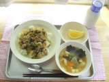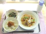 ランチ☆つうしん 今日の献立は、わかめごはん、韓国風肉じゃがうま煮、パリパ...