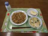 今日の献立)ソース焼きそば・牛乳・にらたまスープ・果物(りんご) 「にらたまス...
