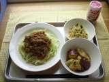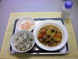 ランチ☆つうしん 今日の献立は、ドライカレーライス、じゃがいもサラダ、福神...