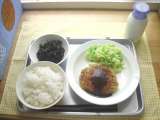 ランチ☆つうしん 今日の献立は、ごはん、むろアジのメンチカツ、ゆでキャベツ...