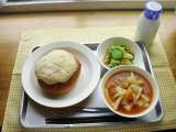 ランチ☆つうしん 今日の献立は、メロンパン、ミネストローネ、アスパラガスの...