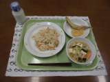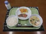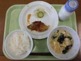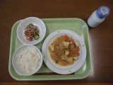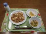 今日の献立)マーボー豆腐焼きそば・牛乳・じゃがいもとピースの煮込み・果物(河内晩...