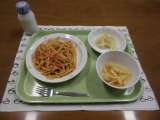 今日の献立)スパゲティーナポリタン・牛乳・コーンサラダ・フライドポテト 今日は...