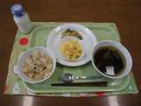 今日の献立)山菜ごはん・牛乳・カリカリおあげと野菜のおひたし・擬製豆腐・すまし汁...