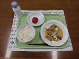 今日の献立)新しょうがとじゃこのごはん・牛乳・すきやき煮・果物(プラム) 初夏...