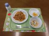 今日の献立)スパゲティーナポリタン・牛乳・シーザースサラダ・果物(バレンシアオレ...