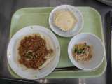 <本日の献立> ジャージャーうどん 塩ナムル 米粉の黄桃蒸しパン
