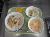 <本日の献立> レタスとじゃこのチャーハン 卵スープ 野菜ソテー みかんゼリー ...