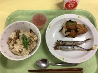 今日の献立とりめし 焼きししゃも 生揚げの煮浸し あじさいゼリー 牛乳