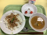 今日の献立ふわふわそぼろ丼 かぼちゃのみそ汁 さくらんぼ 牛乳
