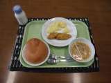 今日の献立)ショートニングパン・牛乳・魚のカレー揚げ・粉ふきいも・ヌードルスープ...