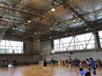 天井の新しい遮熱シートがまばゆい中丸ホールで、4年生がクラスレクを行っていまし...