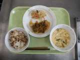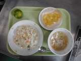 <本日の献立> ピラフ じゃがいものマヨネーズ焼き 野菜スープ くだもの