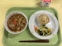今日の献立味噌煮込みうどん 塩だれキャベツ 鬼まんじゅう 牛乳味噌煮込みうどんと鬼まんじゅうは愛知県の郷土料理です。味噌煮込みうどんは愛知県の八丁味噌で煮込んで作りました。