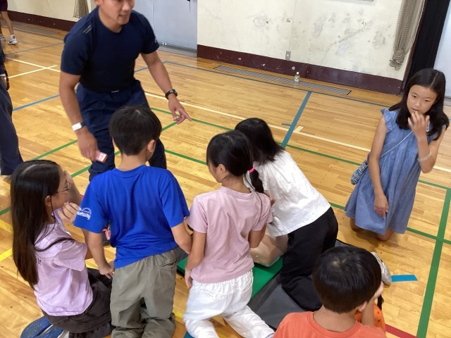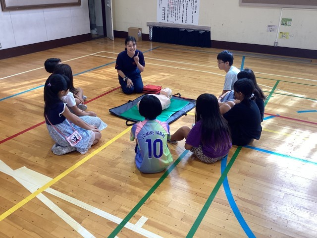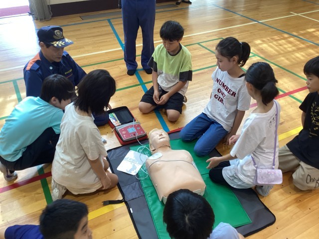 5年生は、消防署と消防団員の方に、救命救急の方法と実技を教わっていました。